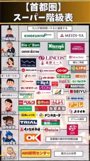 更下面的,如オーケー (OK Store)、业务超市 (Gyomu Super)、ドン・キホーテ (Don Quijote)、トライアル (Trial),关西的サンディ (Sunday)、LAMU等等,它们确实以惊人的低价吸引人,被称为“庶民的味方”或“价格破坏者”。