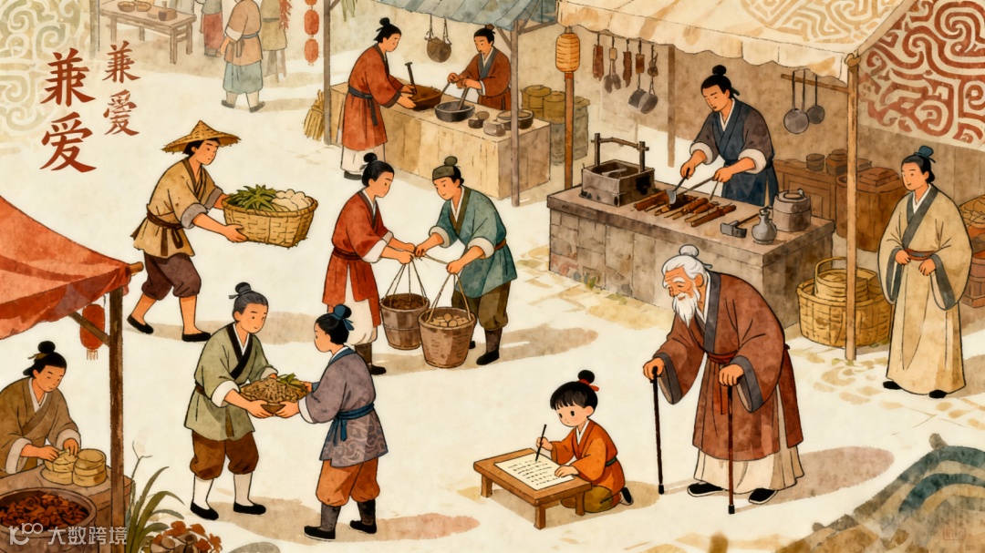 “兼爱”是墨家思想的灵魂,也是其所有主张的理论基石。墨家所言的“兼爱”,是一种打破等级壁垒、摒弃亲疏差别的平等之爱。在《墨子・兼爱上》中对这种爱有明确阐释:“视人之室若其室”“视人身若其身”“视人家若其家”“视人国若其国”。并提出,若天下人皆能践行此道,“国与国不相攻,家与家不相乱,盗贼无有,君臣父子皆能孝慈”,天下便可得治。这种爱摒弃差别,主张对所有人一视同仁,不论身份、贫富、强弱。此外,更打破了血缘亲疏与等级制度的双重界限,将爱的对象从家族内部扩展至天下众人,形成了具有普世意义的平等之爱。