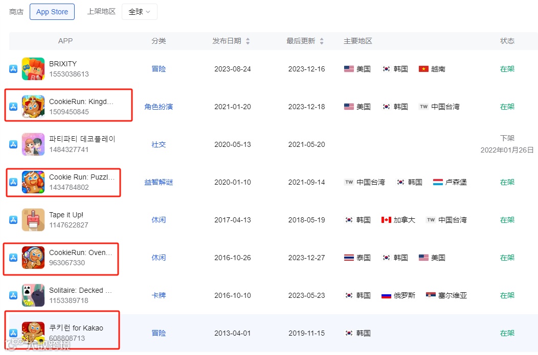 2016年上线的跑酷游戏《CookieRun: OvenBreak》目前依然位于老挝iOS游戏畅销榜第39名、韩国40名以及泰国66名,2023年其全年双端流水达1.98亿。2019年上线的三消《Cookie Run: Puzzle World》当前表现较为糟糕,2023年全年双端流水仅为44万。