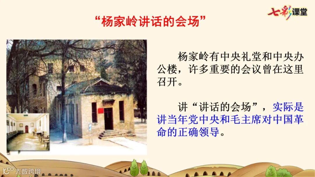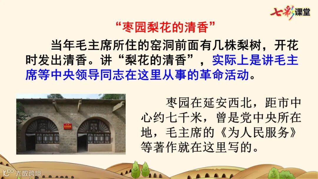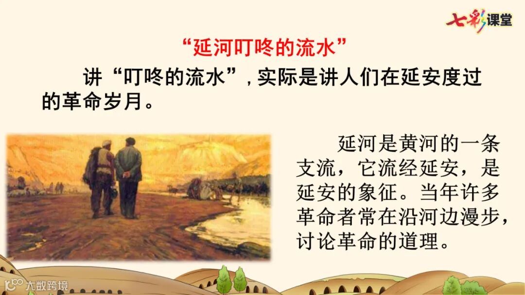 叮咚的流水,实际是讲人们在延安度过的革命岁月。讲梨花的清香,实际上是讲毛主席等中央领导同志在这里从事的革命活动。讲开荒的镢头,实际是讲大生产运动中所体现的自力更生,艰苦奋斗的革命精神。讲讲话的会场,实际是讲当年党中央和毛主席对中国革命的正确领导。
