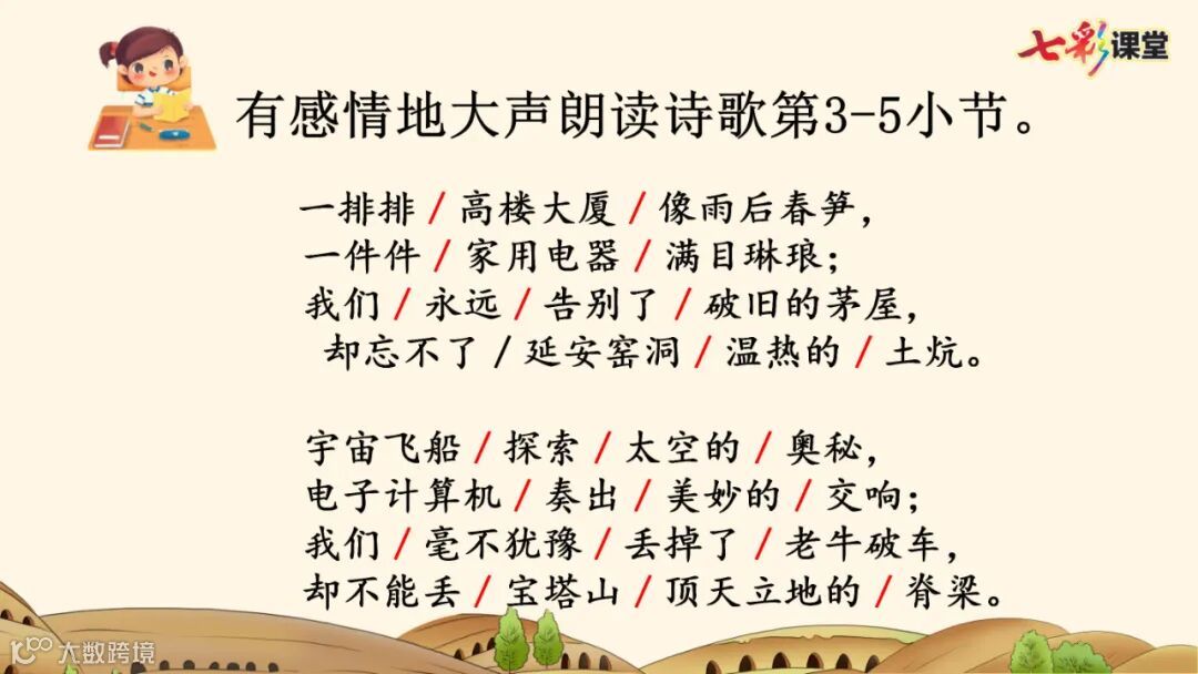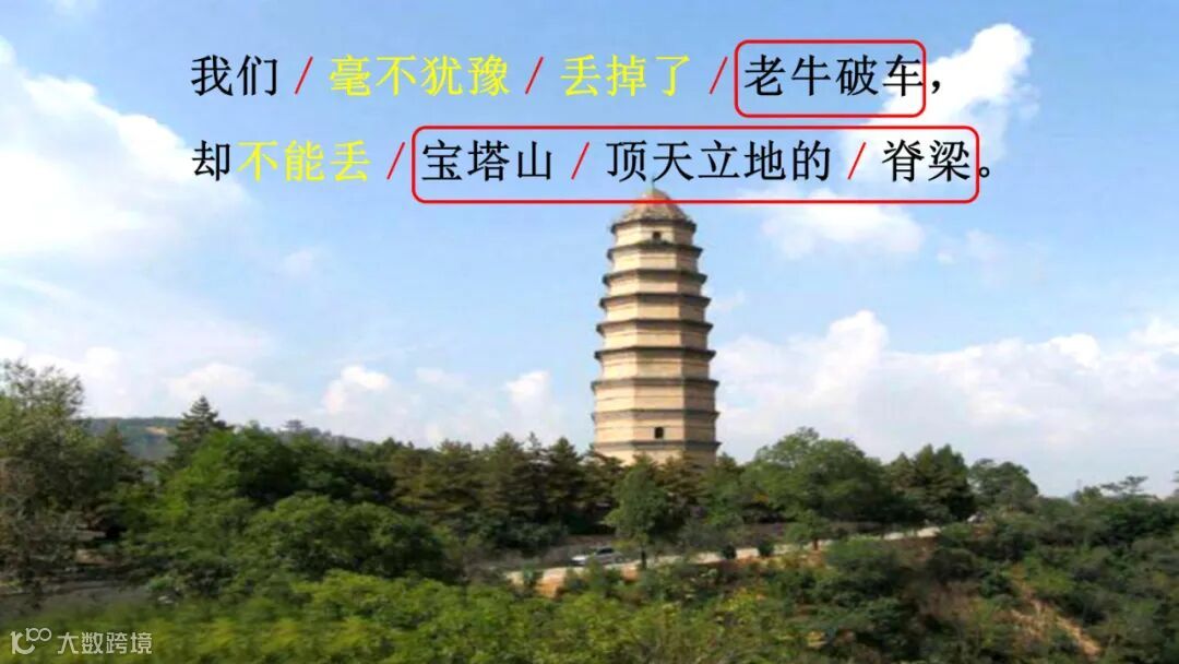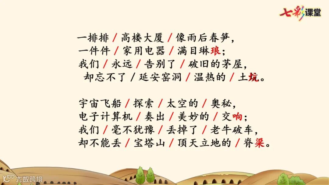 3.一排排高楼大厦像雨后春笋,一件件家用电器满目琳琅;我们永远告别了破旧的茅屋,却忘不了延安窑洞温热的土炕。航天飞机探索宇宙的奥妙,电子计算机奏出美妙的交响;我们毫不犹豫丢掉了老牛破车,但不能丢宝塔山顶天立地的脊梁。