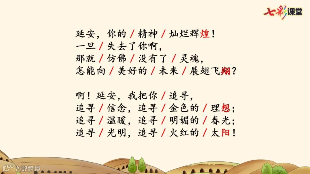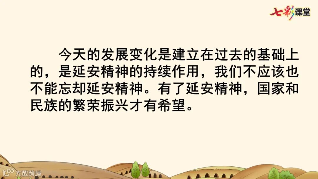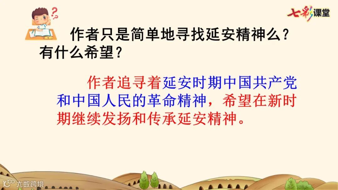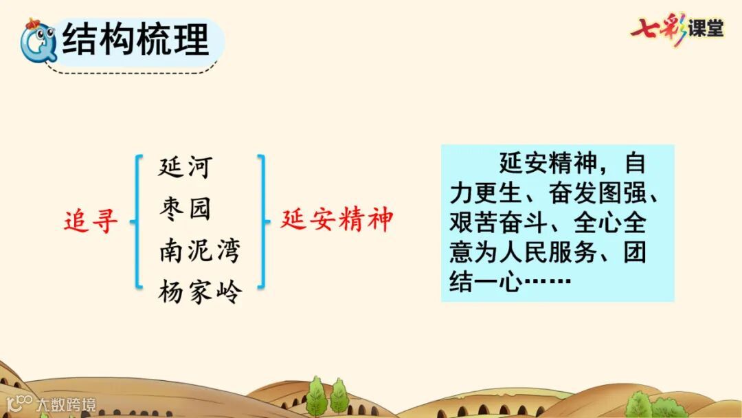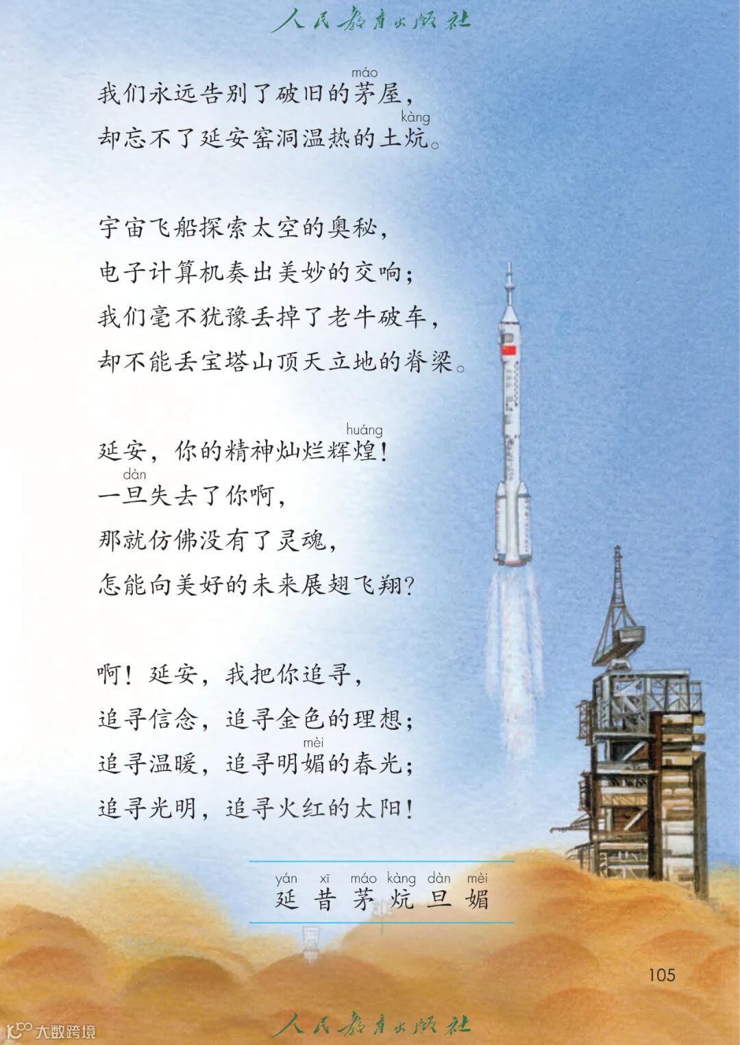 本课是一首诗,诗的第一、二两节写对延安精神的追寻,第三、四两节写实现现代化需要延安精神,第五、六两节写追寻延安精神的重要意义。该诗表达了作者对延安精神的赞扬和对人们在现代化建设中继续发扬延安精神的希望。