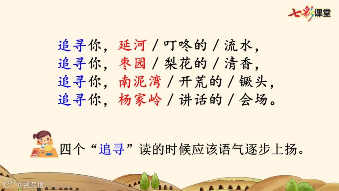 2.追寻你,延河叮咚的流水,追寻你,枣园梨花的清香,追寻你,南泥湾开荒的镢头,追寻你,杨家岭讲话的会场。