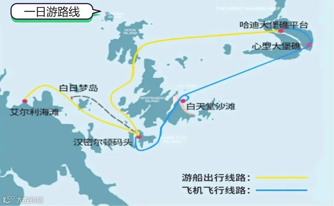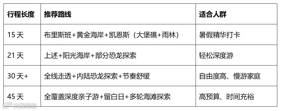 (抵达)布里斯班(必去) → (自驾)黄金海岸(必去)→ (自驾)阳光海岸(选去)→(航班)圣灵群岛(选去)→(自驾)凯恩斯与大堡礁(必去) → (航班)恐龙探索(选去) → 回国。