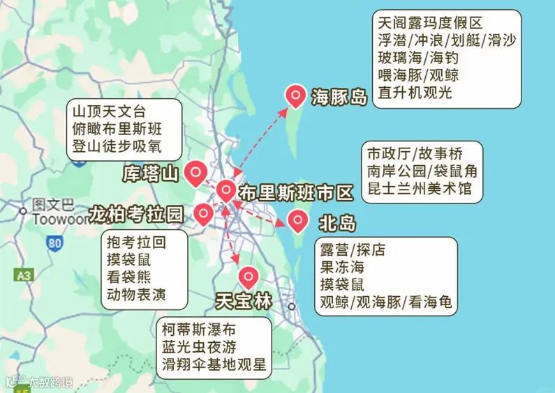 这是昆士兰州首府,城市配套完善,生活节奏悠闲,非常适合亲子闲逛。看下面地图,景点主要集中在市区,郊区景点也不远。