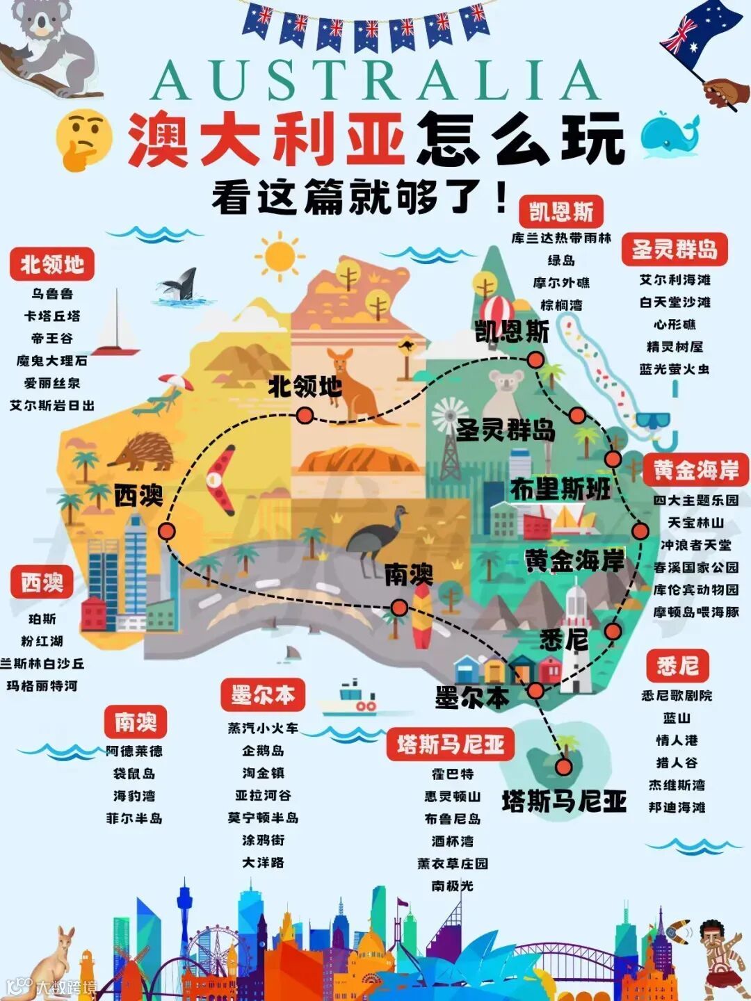接下来,我会以亲子游为重点,把昆士兰州值得带孩子去的城市、景点、地标罗列清楚,中间会附带一些吃住玩建议、交通方式、路线安排。你可以根据自己的时间取舍。