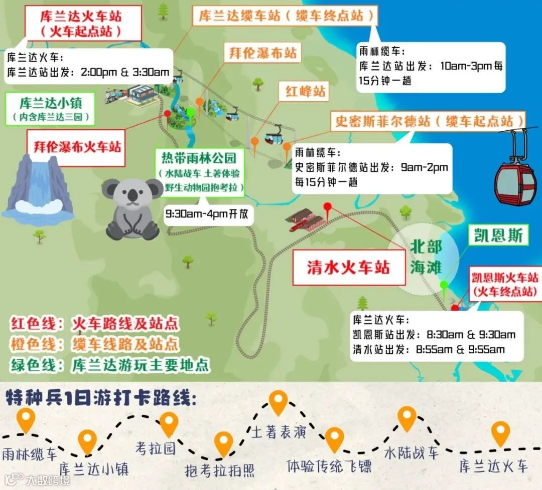 📌库兰达雨林小火车 + Skyrail缆车:通常安排的是雨林一日游,常规路线见下图。