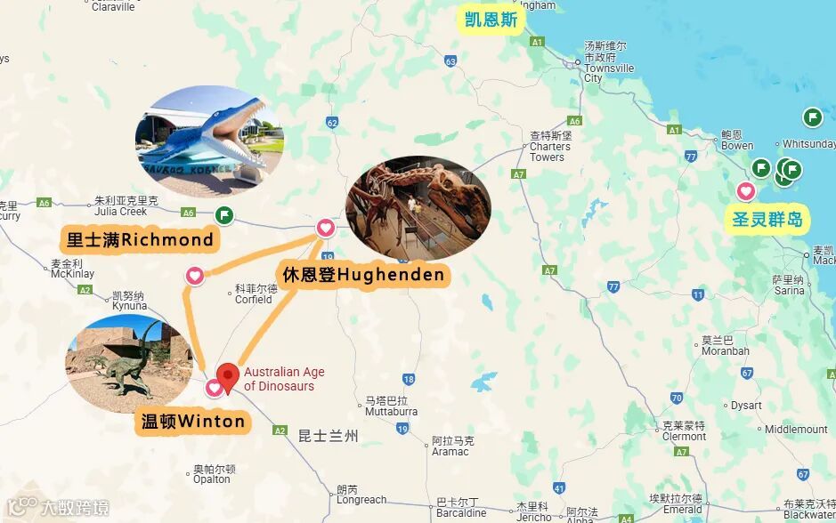 恐龙探索之旅,分布在三个小镇:温顿Winton, 休恩登Hughenden and 里士满Richmond。这三个小镇地理位置行程一个三角形,又叫恐龙三角 Dinosaur Trail(见下图),建议自驾。