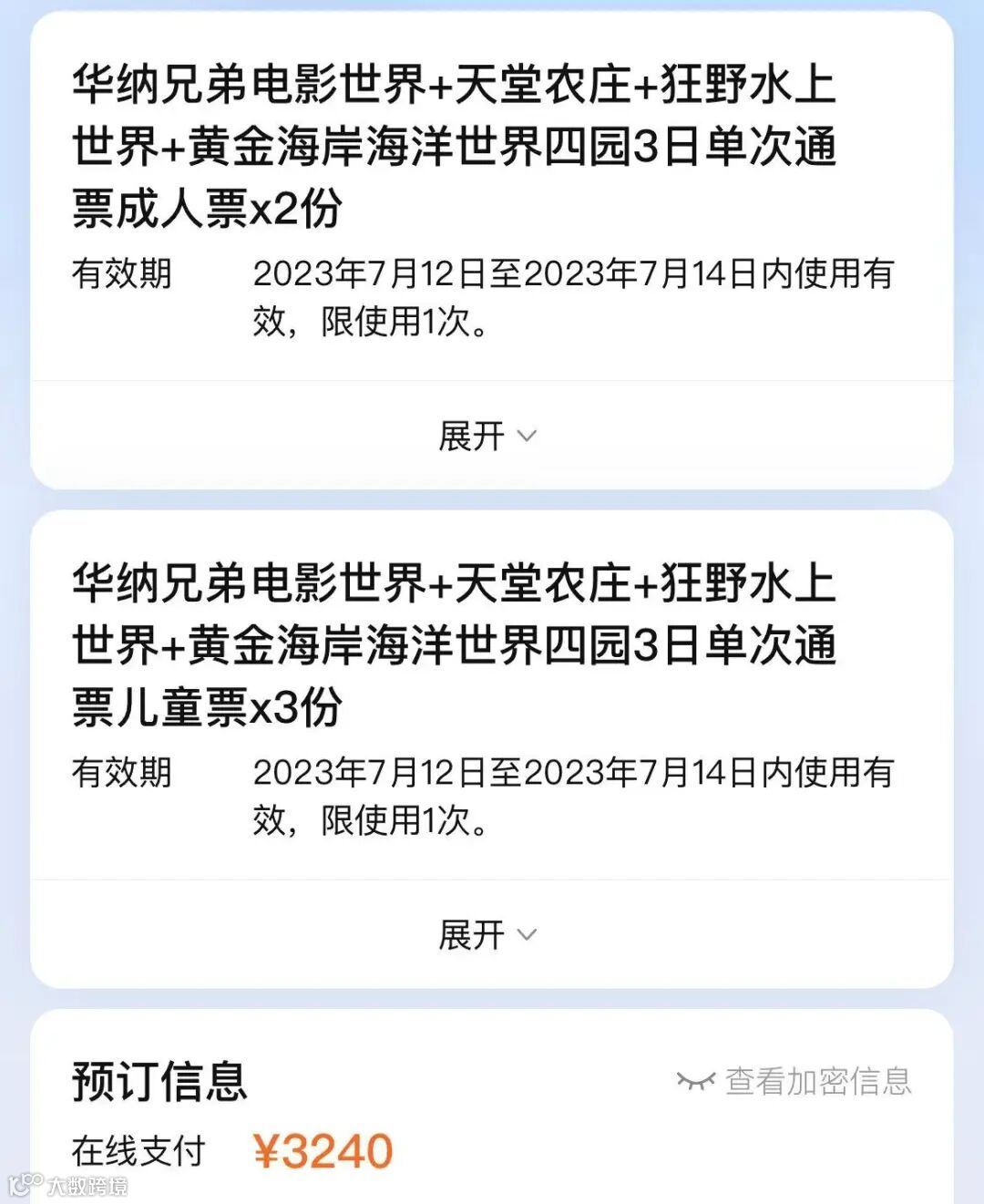 以上几个主题乐园的门票,可以买套票,就是几个园区的门票一起买,便宜很多。我们当时2大3小,4园3日,3200多,人均600多元(见下图)。