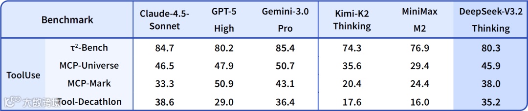 表2:DeepSeek-V3.2 与其他模型在智能体工具调用评测集上的得分
