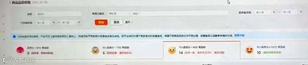 重点关注差评中集中反映的问题,如尺寸不准、功能不符等,针对性改进比盲目降价更有效。 品质分看趋势比看单点数值更重要 品质分常被新手忽略,因其需累计超10条评价且有两天延迟,等到分数显示偏低时,问题往往已积累较多。 **60分是警戒线**,低于该分数将大幅增加平台抽查概率。