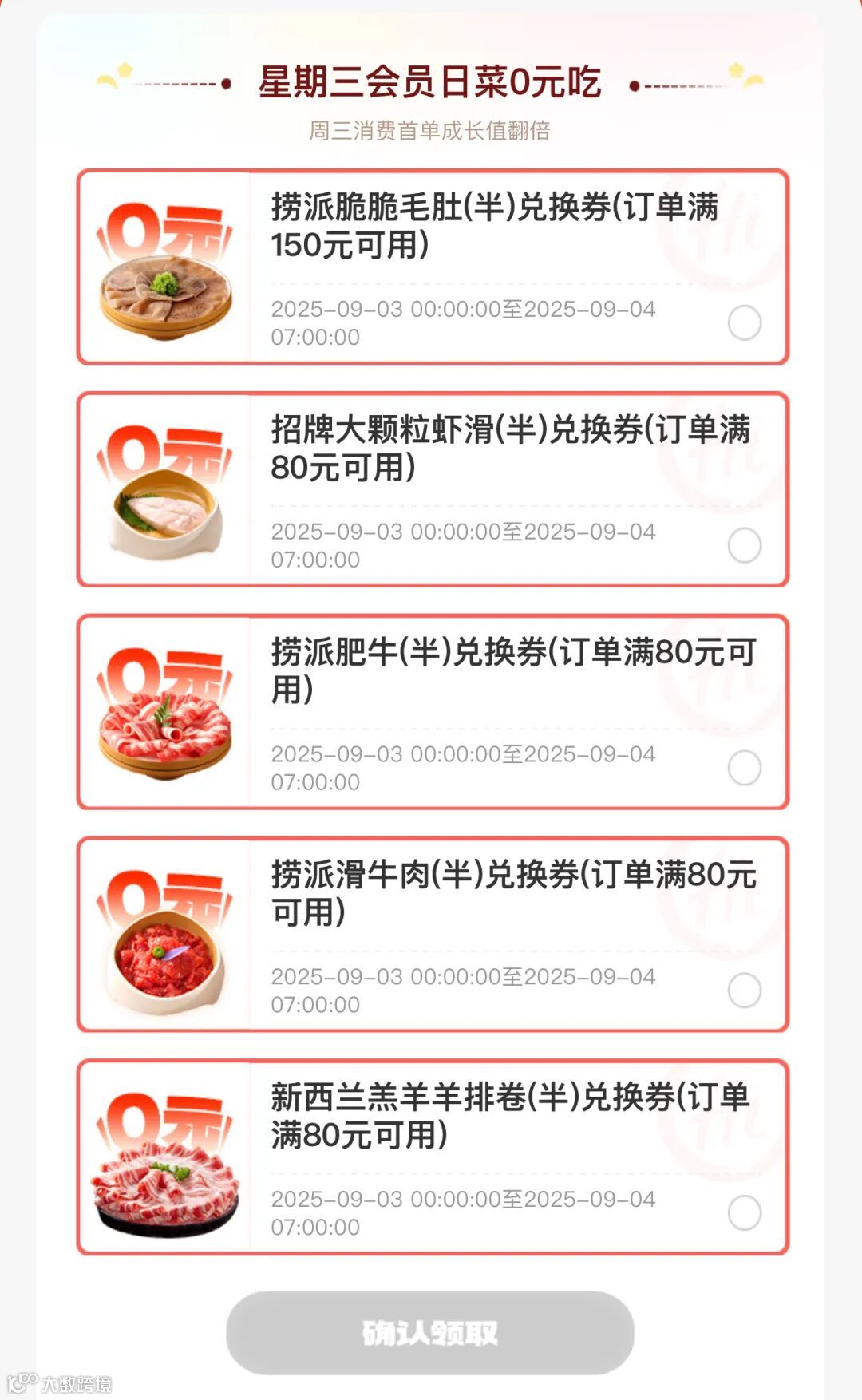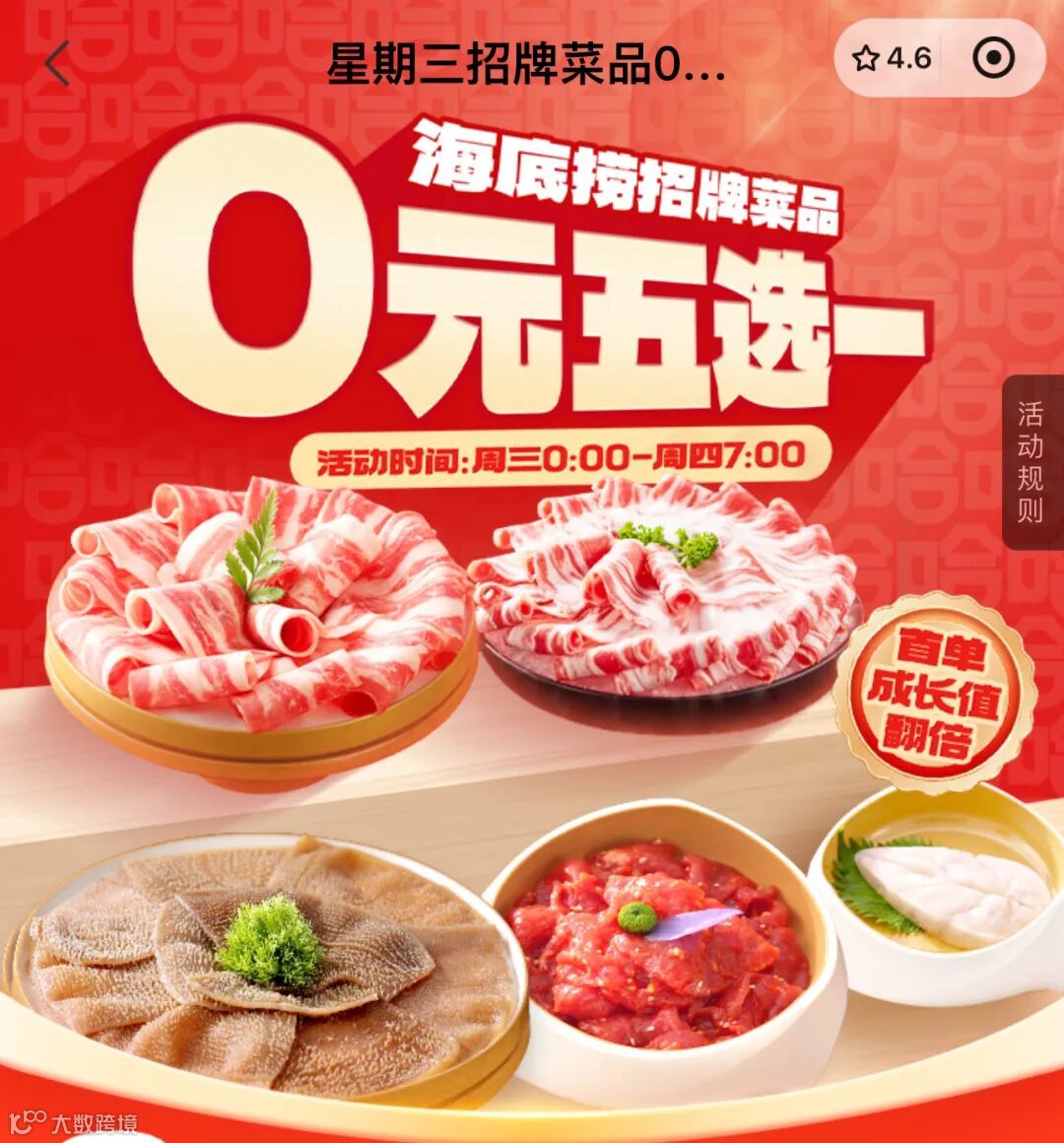 活动内容:活动期间,可免费领取捞派肥牛(半份)兑换券或捞派滑牛肉(半份)兑换券或招牌大颗粒虾滑(半份)兑换券或新西兰羔羊羊排卷(半份)兑换券或捞派脆脆毛肚(半份)兑换券。