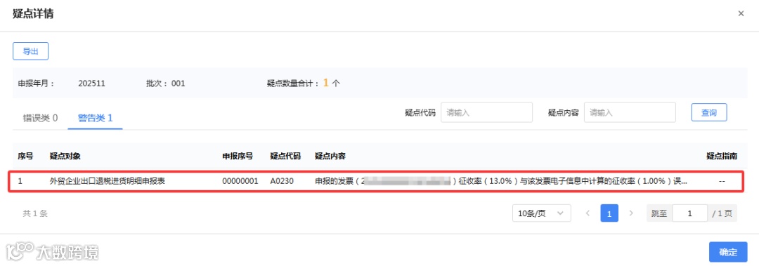 在使用小规模纳税人开具的1%或3%专票申报退税时,若发票税率低于出口退税率,应按照发票所列征收率手工修改退税申报系统的“征税率”字段。否则,税务系统将提示“申报的发票征收率与该发票电子信息中计算的征收率误差超1%”的疑点。