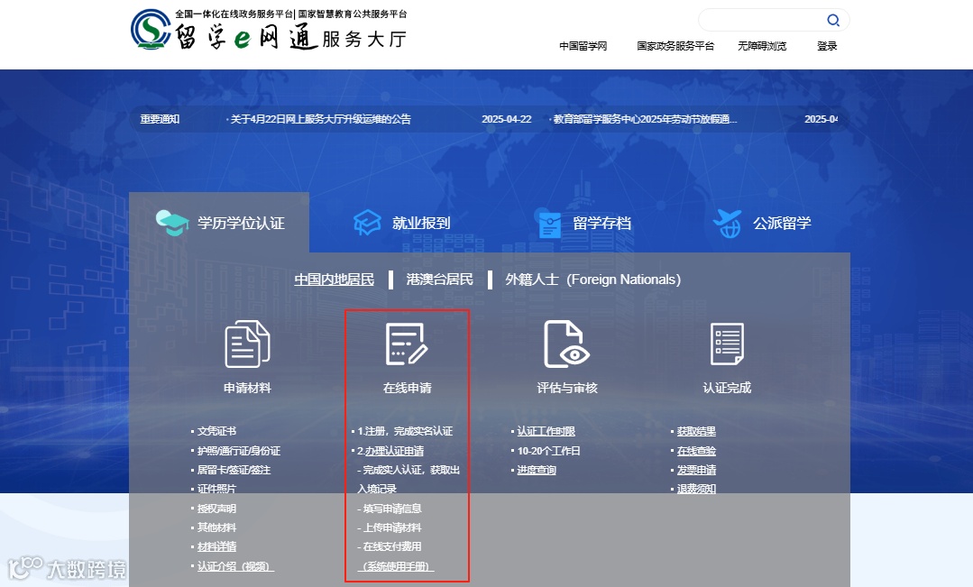 访问教育部留学服务中心网上服务大厅 → “学历学位认证” → “在线申请”。