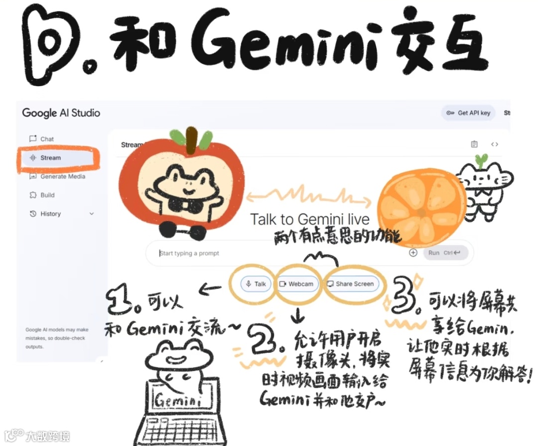 👉摄像头互动:开启摄像头,让Gemini“看”实时画面(比如展示手工作品,让它分析改进点)。