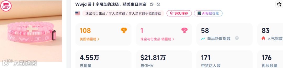 一款来自义乌的平价手链,在TikTok美区市场30天内售出4.4万件,销售额超21.81万美元(约154万元人民币),登顶珠宝类目销量榜首。