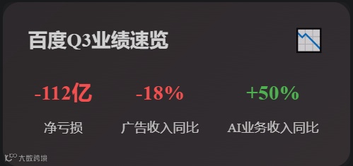 2025年第三季度,百度净亏损达 112.3亿元,总营收同比下降 7%。其核心在线营销业务(广告)收入同比下滑 18%,已连续六个季度负增长,构成裁员最直接导火索。