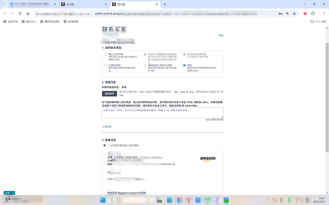 1.功能全面禁用:FBA订单详情页的“联系买家”选项已变为灰色不可用状态,仅保留“发送发票消息模板”功能,且系统新增提示“此订单不是卖家自配送订单”。