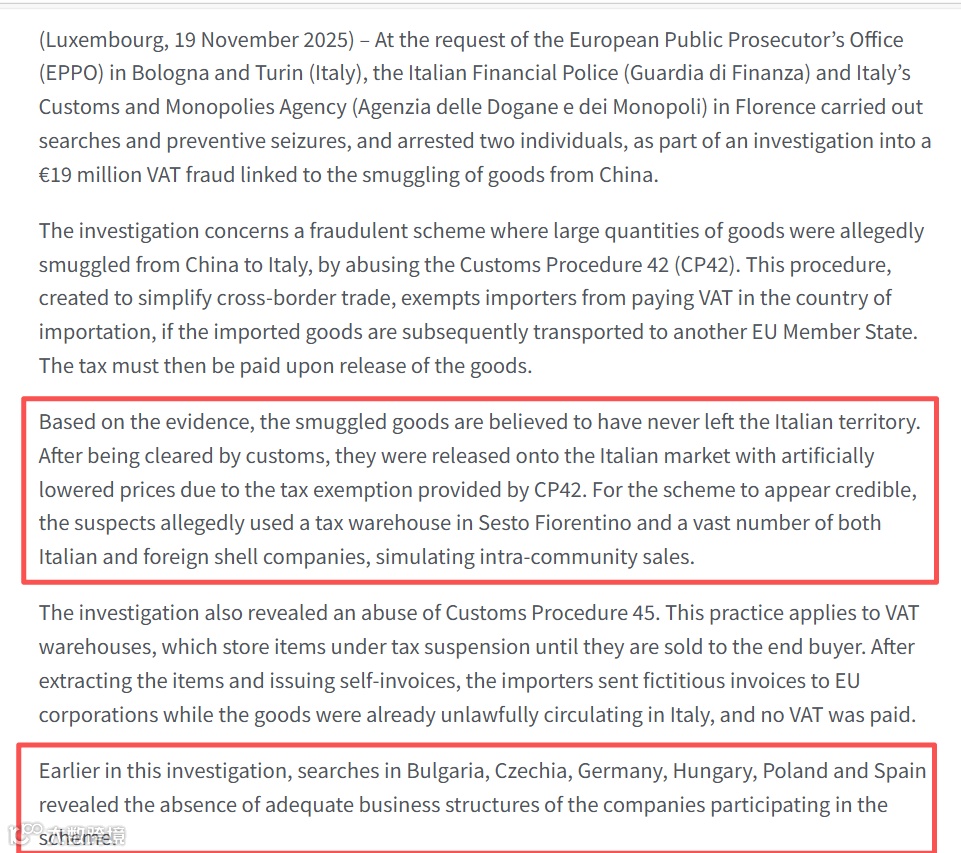 在这次 1900 万欧元的案件中,违规者正是复刻了这套操作:通过 CP42 将中国货物进口至意大利,利用佛罗伦萨某保税仓库及多架空壳公司伪造跨境转运记录,实则将货物在意大利本地快速抛售,借助逃税带来的成本优势抢占市场。