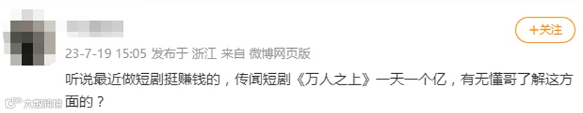 暑期档开启,各类电影电视剧都已经开始争夺市场,其中,短剧成为了炙手可热的选择之一。爱奇艺、优酷、腾讯等长视频平台都推出了中短剧系列,抖音、快手上的各类短剧也逐渐成熟,播放量动辄破亿。据相关数据显示,截止2023年6月30日,短剧在中国大陆的市场每天的收入已经接近1亿人民币。短剧高转化、高分成已经彻底让整个行业沸腾,在各路平台和资本的加码之下,国内市场的短剧成了一片红海,但红海的水面下还有一门“闷声发大财”的生意——短剧出海。相比30-50分钟的长剧集,一集短剧的时长被精准控制在几十秒至几分钟内,无注水、高密度的剧情让观众大呼过瘾,一口气刷上十几集也难停下来。对于国人来说如此,对于处于碎片化时代的海外观众也同样适用。为配合欧美地区的快节奏观剧习惯,大部分欧美短剧时长都控制在了一分钟以内。许多展示方式也都是以连贯的剧情推出,欧美式直给的剧集风格,点赞量与互动率齐飞。例如,在TikTok上的许多短剧博主也拥有大批量的粉丝,不同短剧合集也给用户更好的追剧体验。视频来源:TikTok在欧美地区,除了TikTok,流量大的短剧平台则是以ReelShort为代表,当然,部分短剧平台都在向ReelShore看齐,从平台模式衍生出自己的短剧APP。“l'm too hooked on the story now(我太上头了)!”一位海外观众对海外的短剧APP ReelShort,这样评价道,“ enjoying enough to keep watching(很喜欢看)”。