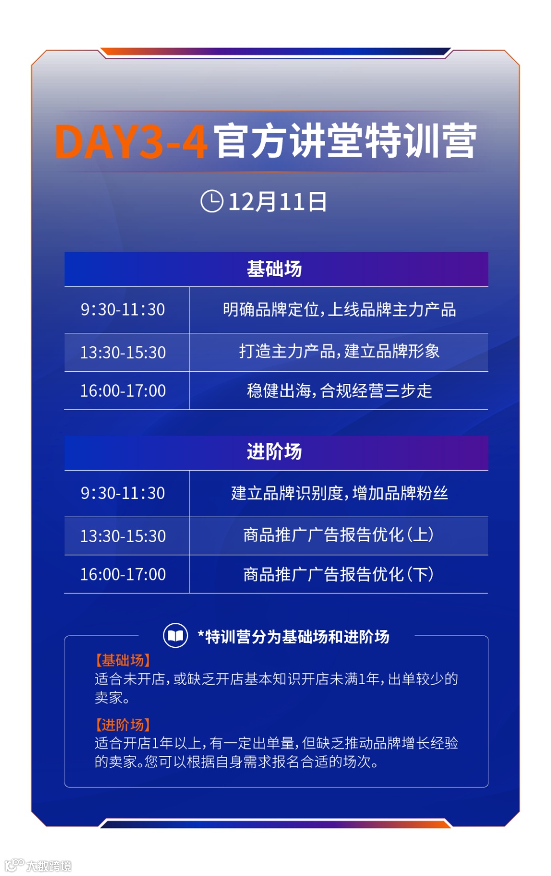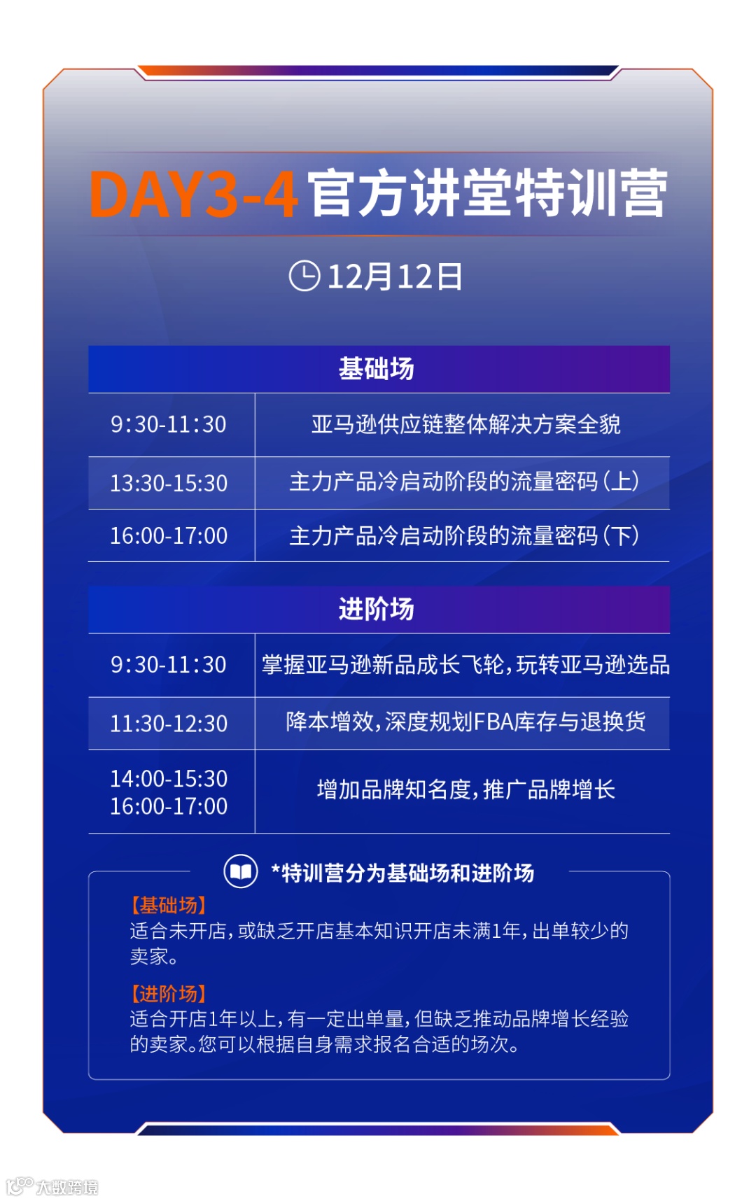 如果您报名线下特训营,无论是基础场还是进阶场,都包含可以线下参加Day1-2主会权益。我们还为线下特训营的卖家准备了会后的线上复盘课,帮助更好掌握培训内容。另外,温馨提醒下,线下特训营涵盖亚马逊卖家成长服务官方专属顾问1对1咨询服务,您可以在报名同时选择该权益。线上特训营适合时间不合适或无法来南京参会的卖家。在大会结束后两周内,线下和线上参加特训营的卖家均可享受培训内容的线上回放服务,您可以随时播放。