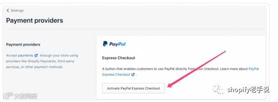 1. Shopify的后台,点击左下角的Settings – 然后点击Payment Providers,选择Express Checkout选项,点击Activate PayPal Express Checkout按钮。浏览器会在新窗口中打开PayPal的登陆页面,只输入你注册好的企业PayPal,登陆邮箱和密码,以及选择PayPal账户注册的时候所属国家。然后点击下一步按钮。