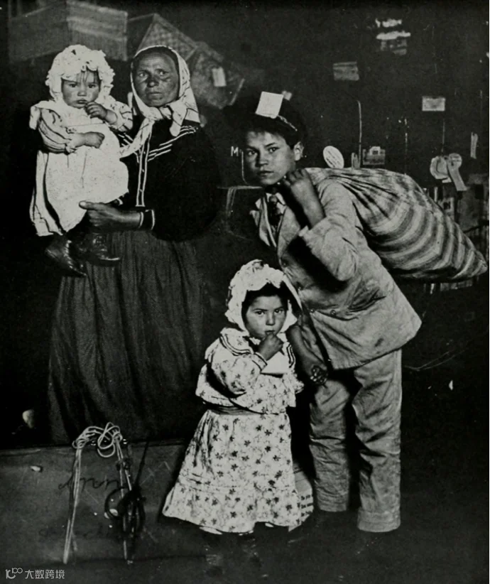 © 海因:《寻找遗失行李的意大利家庭,埃利斯岛,1905》(Italian family seeking lost baggage, Ellis Island, 1905)。摄影联盟,纽约