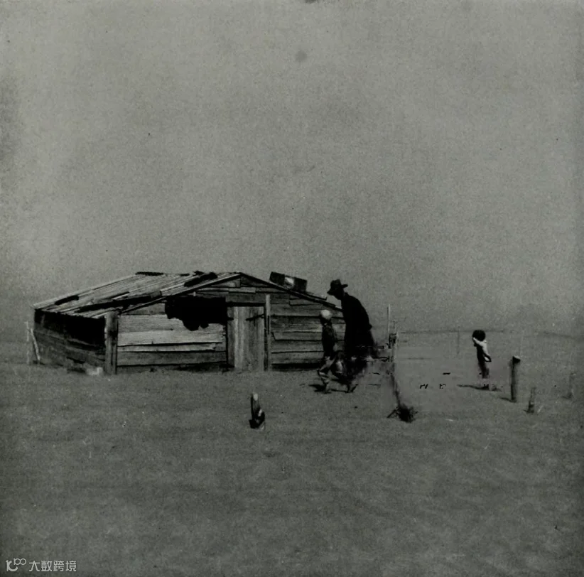 © 罗斯坦: 《父亲和儿子在尘土风暴中行走,位于俄克拉荷马州西马龙县》(Father and son walking in the face of a dust storm,Cimarron County, Oklahoma)。为农场安全管理局而摄,1936年。现代艺术博物馆