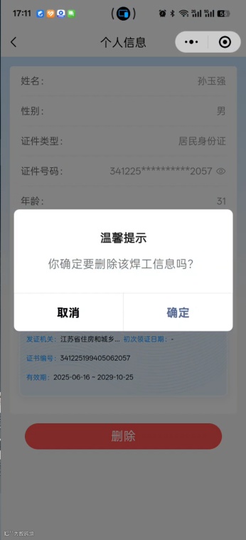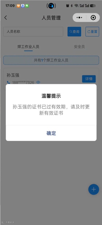 如本项目存在焊工证书过期或证书到达年审期的情况,系统会提醒安全员重点关注。证书过期将无法扫码启动焊机。