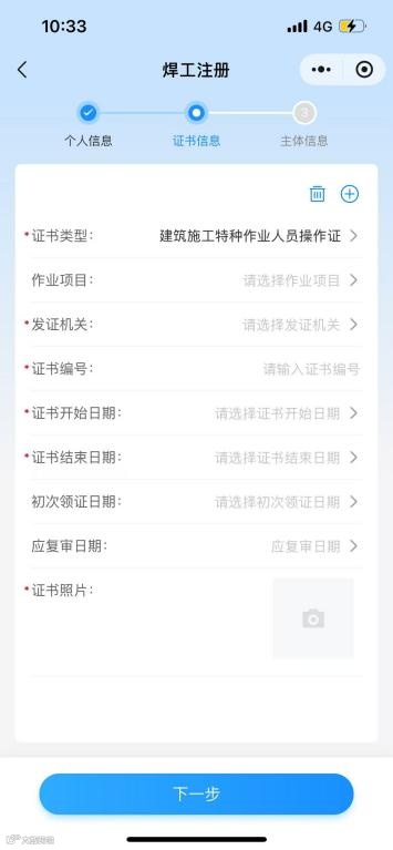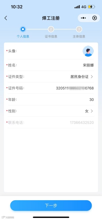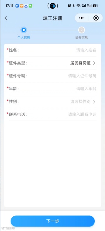 第二步:在焊工注册页面输入【姓名】与【身份证号】,年龄、性别和手机号将自动获取,点击【下一步】。