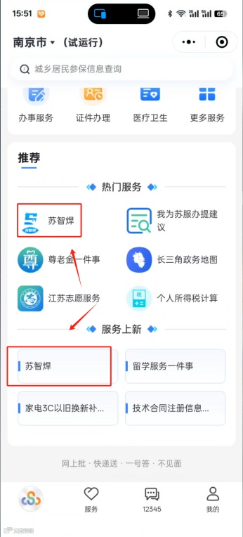(3)进入“苏服办”小程序,在“苏服办”首页【热门服务】和【服务上新】栏目中,选择“苏智焊”,跳转进入小程序。