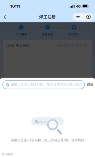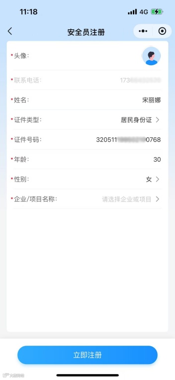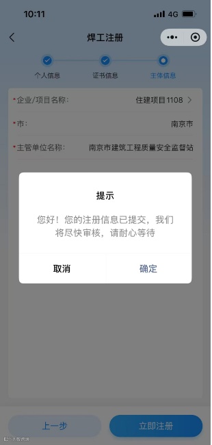 第四步:选择焊工所属的项目信息,此处只需搜索项目名称或施工许可证号的关键词,搜索后选择即可,如没有,可在安全员注册界面进行新增。完成后,点击【立即注册】,即完成注册,等待审核。