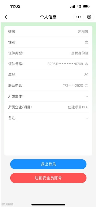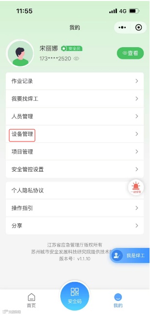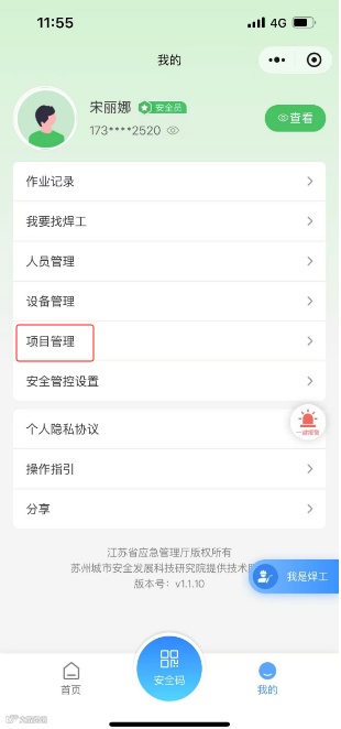 完成注册后,点击【我的】,可对本项目的人员、设备、项目信息和安全管控进行管理。