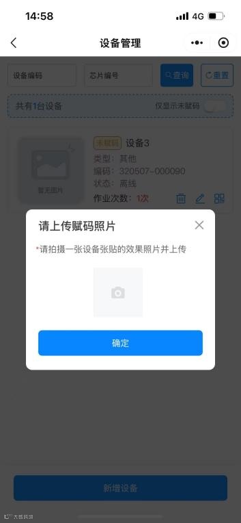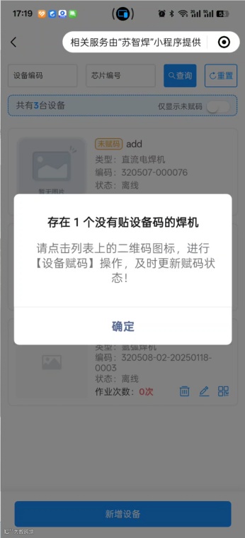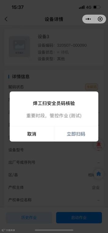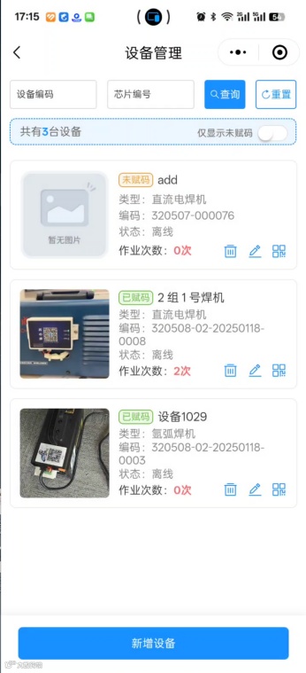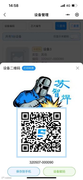 】可查看设备二维码;打印此二维码并粘贴到对应的设备上,赋码完成后,点击【设备赋码】上传赋码照片,完成焊机赋码。焊工扫描此二维码可进行开关机,点击【