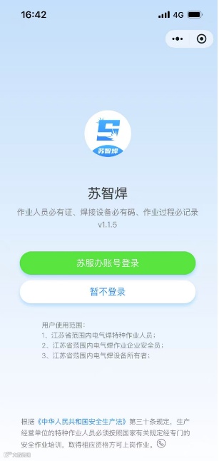 (1)扫描焊机上的“苏智焊”二维码(见下图),直接进入“苏智焊”小程序。首次进入,选择苏服办授权登录,登录后进入注册页面,后续扫描无需登录,直接进入焊机开机界面。