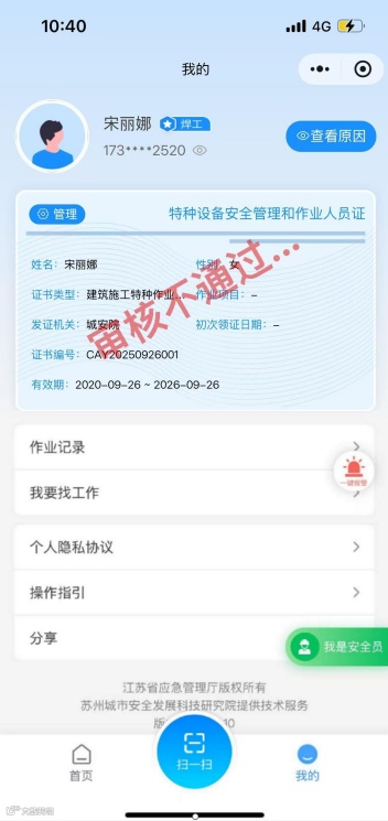 电气焊作业人员第一次登录“苏智焊”时,需注册账号,并对证书进行真伪验证。建筑施工特种作业人员操作证(建筑焊工、建筑电工),需输入证件信息,输入后后台将第一时间进行人工核验。注册验证过程分为四步: