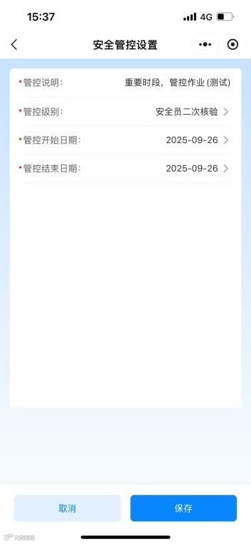 在【我的】中点击【安全管控设置】,进入设置页面,输入管控说明、管控级别(安全员二次核验、禁止动工),选择管控开始时间和结束时间,可对本项目进行动火作业管控(新增管控级别为“禁止动工”的,需上级部门审核)。如设置本月动火作业,需安全员二次核验后才能启动作业。焊工扫码启动焊机后,必须再次扫描安全员的安全二维码才能启动焊机。安全员的安全码为动态更新,无法截图使用。