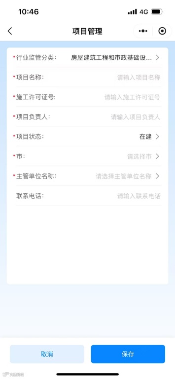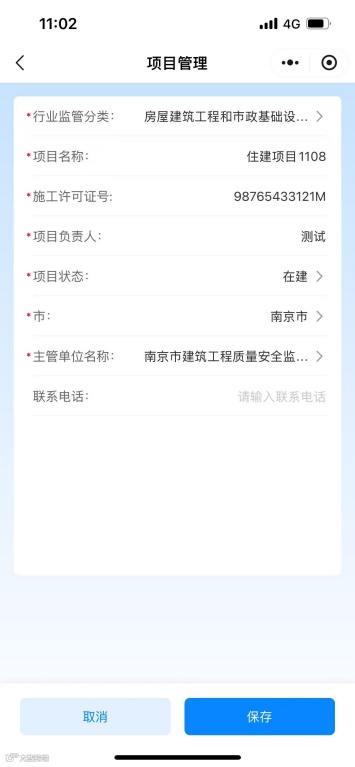 点击【项目管理】,进入项目基本信息编辑界面,可对行业监管分类、项目名称、施工许可证号、项目负责人、项目状态等信息进行编辑修改。