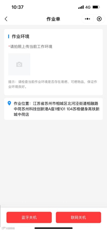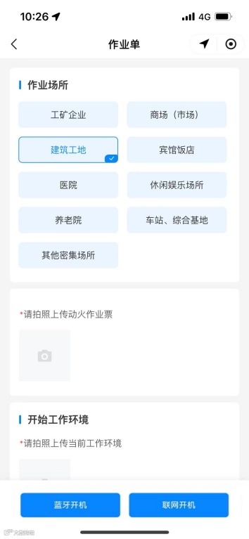 第三步:在作业单页面选择作业场所“建筑工地”(第二次进入时默认为上次选择的作业场所)。上传动火作业票及作业环境照片,点击【联网作业】与【蓝牙开机】启动焊机。