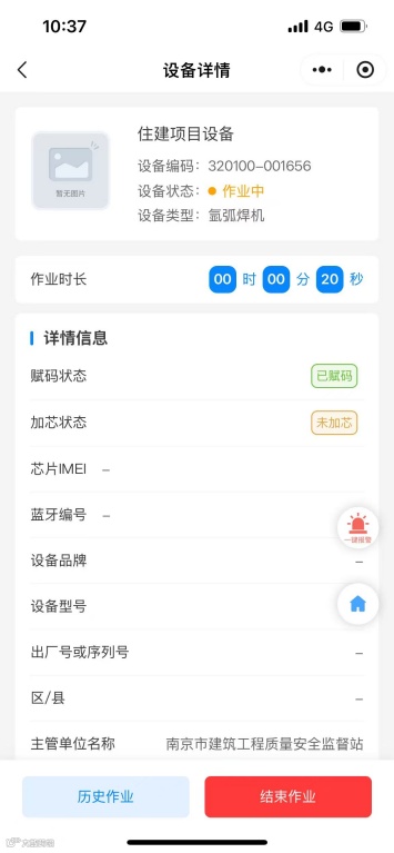第四步:作业结束后,在设备详情页面点击【结束作业】,进入结束作业后的作业单页面。