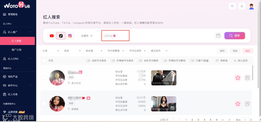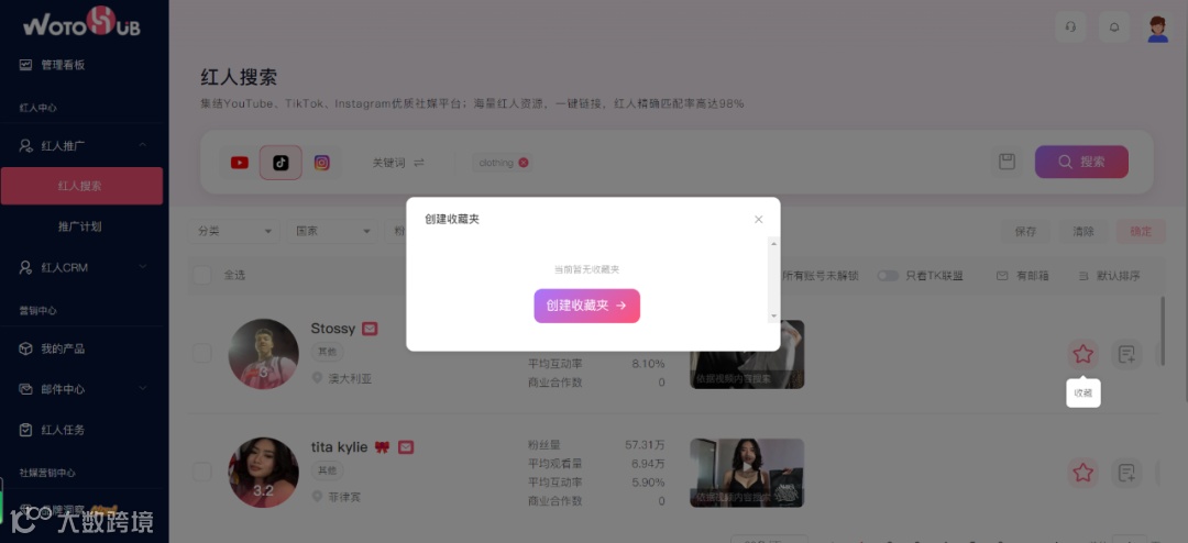 我们在WotoHub后台根据产品关键词搜索相关的KOL。对感兴趣的红人,可以先放在收藏夹。比如你是服装行业的,想在Tik Tok上推广,可以搜索“clothing”,WotoHub会把系统内所有的相关KOL资源尽数展现。