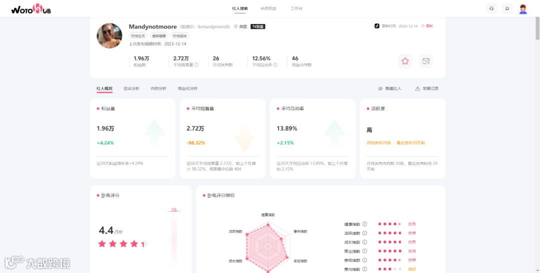 筛选KOL对于红人营销非常重要,因为合适的才是最好的。WotoHub的平台会显示红人概况、受众分析、内容分析、商业化分析等四个大类的数据。我们根据需要来判定这个红人账号是否符合我们的定位。