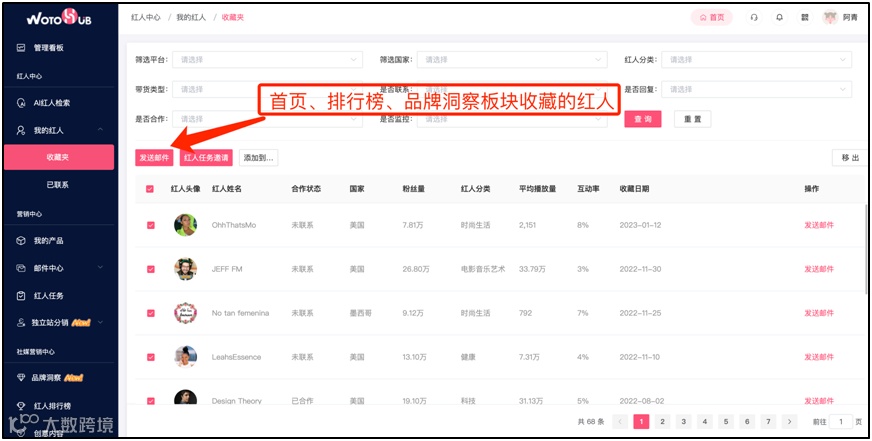 当我们确定好红人账号后,就要跟红人联系了。可以在我的红人-收藏夹中,和所有符合我们要求的红人进行联系。跟红人联系时建议准备好产品资料、合作流程、收款细节等信息,可以提高谈判效率。