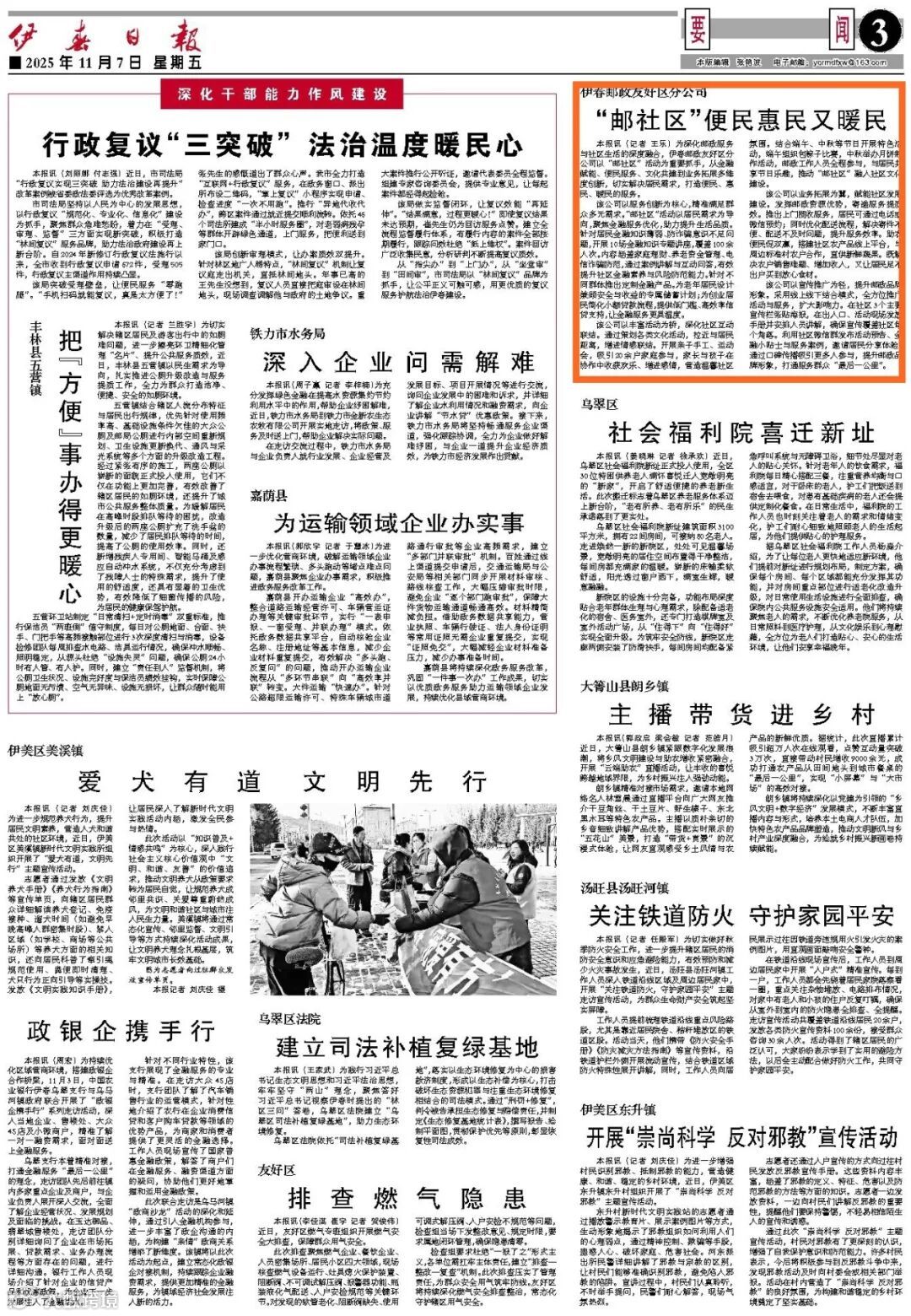 本报讯(记者 王乐)为深化邮政服务与社区生活的深度融合,伊春邮政友好区分公司以“邮社区”活动为重要抓手,从金融赋能、便民服务、文化共建到业务拓展多维度创新,切实解决居民需求,打造便民、惠民、暖民的服务。