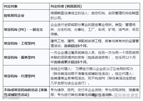 常设机构:中国企业在韩设有固定场所(如办公室、工厂)、持续时间超过6个月的工程建设项目、或在一年内提供服务累计超6个月,或授权人员在韩长期代表企业签订合同,均可能构成常设机构,需就相关所得在韩国纳税[k]。