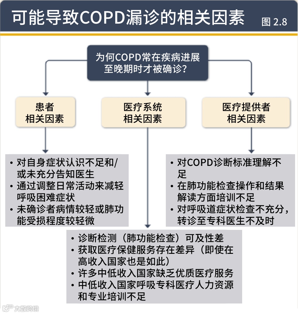 全球范围内,超过70%COPD患者未被确诊,中低收入国家更为严重,漏诊率超过90%。未确诊患者生活质量差,其急性加重风险、全因死亡风险及呼吸相关死亡风险分别增至无COPD人群的15.5倍、2倍和4.3倍。