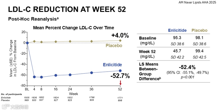 在 CORALreef Lipids 研究中,Enlicitide 降脂疗效得到有效验证。对已接受稳定降脂疗法治疗或对他汀类药物不耐受的有 ASCVD 事件史或有 ASCVD 风险的成年人,每日一次口服 Enlicitide 后,在第 24 周实现了具有统计学和临床意义的 LDL-C 降低,主要分析降幅为 55.8%(95%CI: -60.9%, -50.7%; P<0.001)(图 2),事后再分析降幅为 59.7%(95%CI: -62.3%, -57.1%; P<0.001)(图 3)。67.5% 的患者达到预先设定的严格目标,即 LDL-C 较基线降低至少 50% 且绝对值<55 mg/dL (1.42 mmol/L),而安慰剂组仅为 1.2%;且 Enlicitide 在一年(第 52 周)持续保持统计学显著的 LDL-C 降幅,主要分析降幅为 47.6%(95CI: -52.7%, -42.5%; P<0.001)(图 4),事后再分析降幅为 52.4%(95%CI: -55.1%, -49.7%; P<0.001)(图 5)。