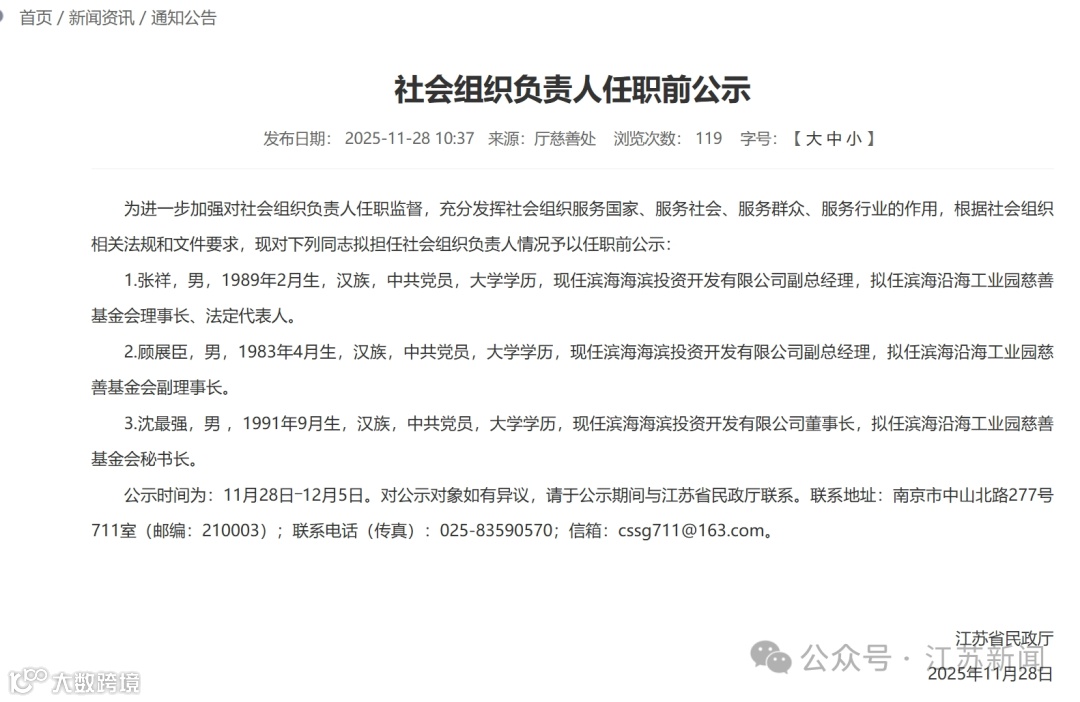 3.沈最强,男 ,1991年9月生,汉族,中共党员,大学学历,现任滨海海滨投资开发有限公司董事长,拟任滨海沿海工业园慈善基金会秘书长。