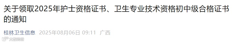 2025年护士资格证书、卫生专业技术资格初中级合格证书已下发至我中心,请各县(市、区)卫生健康局、市直各医疗卫生机构、驻桂各医院、民营医院派专职人员前来领取本辖区本单位证书。考生本人前来领取的,需携带本人身份证,如非本人领取需提供委托书、委托人身份证、被委托人身份证。