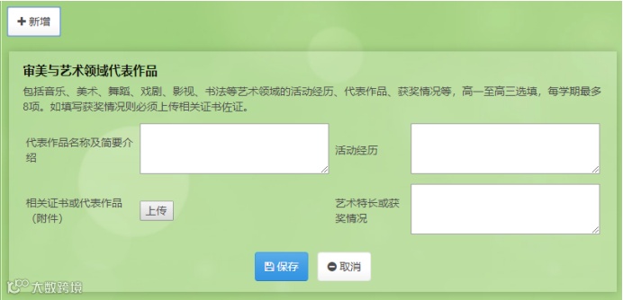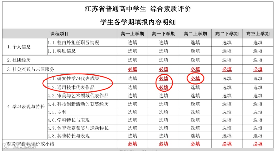 必填项:社会实践与志愿服务(5个学期)、研究性学习代表成果(2个学期)、通用技术代表作品(1个学期)、期末自我评价或小结(5个学期)。